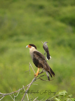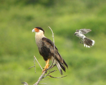 Like this individual, from the moment it landed on its lookout post, it was attacked by a couple of very angry mockingbirds trying to chase it away. It took about 10 minutes for the Caracara to get the message that it was not welcome on this tree and it flew about 50 meters away to another post. Only to be attacked by another couple of mockingbirds there as well. Lesson learned: Even the most ferocious-looking large birds of prey have public enemies who often win the fight. And make no mistake, the sweet singing mockingbird can have a very mean streak.