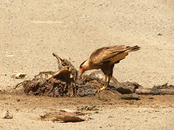 The young Crested Caracaras have left the nest and sometimes still have to search for food together with their parents, but all too often also alone. The young animals group together in larger groups that in some cases can reach a size of 25 animals or more. Clever, because together they can find much more food than alone. Because our human islanders have become so easy at throwing dead dogs, goats and sometimes even donkeys and horses into the mondi, the Crested caracaras (Warawara in Papiamentu) find this a grateful source of food. Especially the young birds, who have not yet mastered the art of hunting live prey, gratefully make use of this free food service.