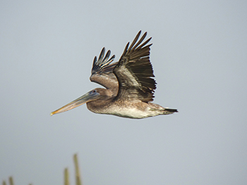 From June onwards, you will see groups of Brown pelicans sitting together along the coast in various places, consisting of a few adults and a whole bunch of young birds. These young birds, born and raised elsewhere in the Caribbean, find the ideal conditions on our coastline to build up their flying experience and also to practice finding food and especially catching it. Along various places, mainly on the northern side of our island, there are so-called ‘training centers’ for these young birds where they extensively practice flying with strong winds and waves. A pleasure to watch.