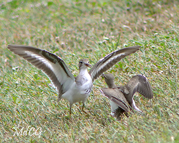 Because the waterfront is becoming increasingly crowded, conflicts are a recurring issue. This is especially true between members of the same species, but certainly also between individuals of different species; everyone wants a spot to find food. These fights are usually not fatal. The photo shows two Spotted Sandpipers in conflict.