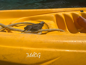 It’s quite common for migratory birds, exhausted during their journey, to seek shelter and rest aboard ships and yachts at sea. Many videos circulate online of people on cruise ships, yachts, and other boats suddenly discovering small songbirds, sandpipers, plovers, and sometimes even birds of prey on the boat. These tired birds are then fortunate enough to be able to rest in relatively safe places before continuing their journey. However, many individuals are not so lucky and end up in the sea. There, they cool down so quickly, if they can even swim, that they quickly die. Sadly, this is how thousands of birds meet their untimely end during migration. Occasionally, such a floating animal is found along the coast by smaller boats or, for example, by people kayaking. This recently happened to a couple of nature lovers who were kayaking along the island’s coast near Westpunt. They pulled the soaked bird from the water and let it recover quietly on the kayak, before setting it down in the shade along the shore. The animal, a Solitary sandpiper, most likely survived its adventure thanks to this action.
