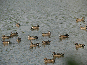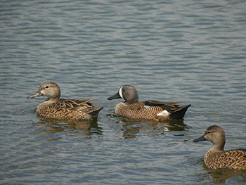 Blue-winged teals, or blue-winged teals as they are called, can be found on Curaçao year-round but do not breed here. While the birds are generally inconspicuously colored, a true metamorphosis occurs in the males (drakes) during December and January. They change to their spectacular breeding plumage, with a dark gray head, black beak, and the distinctive crescent-shaped white patch behind the beak. The birds then form pairs and eventually leave the island to breed elsewhere. Their exact location is unclear.